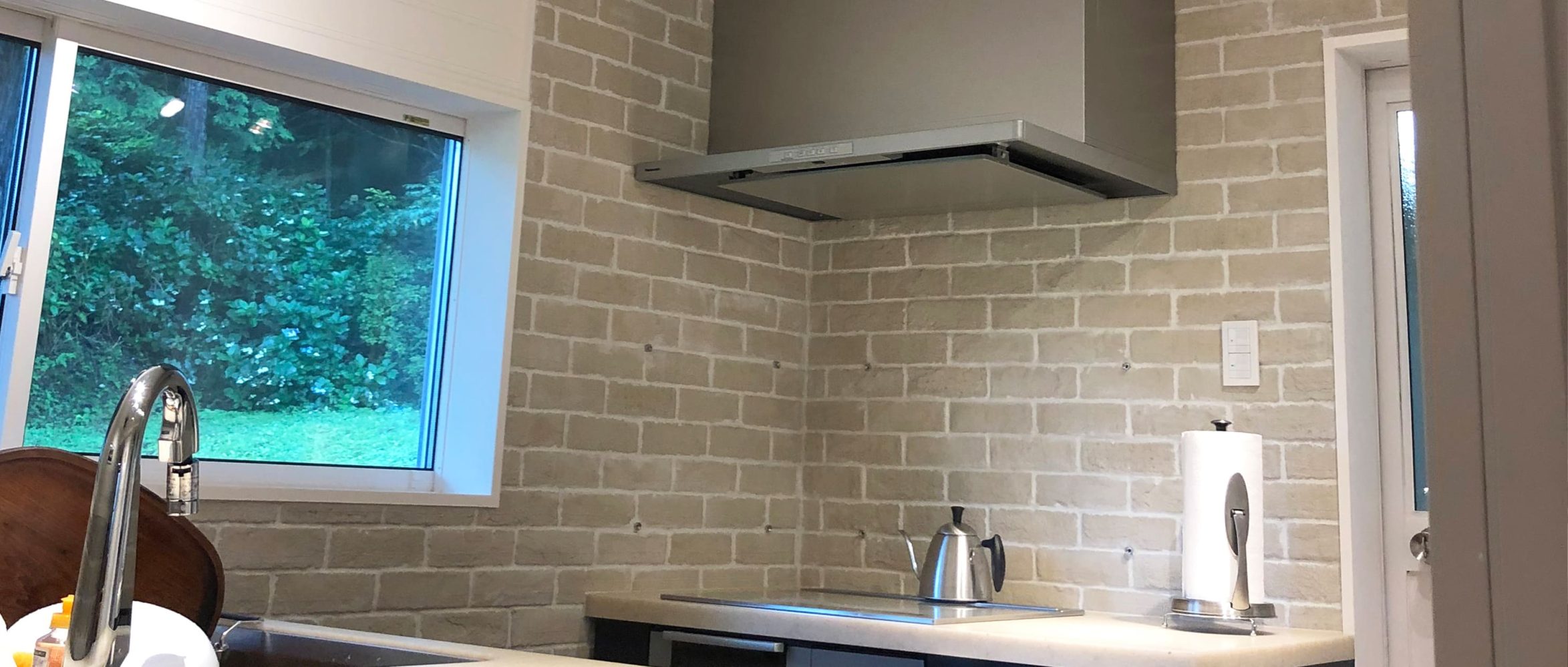 壁の一部には明るいベージュ系のレンガ調タイルをあしらい、単調になりがちな厨房スペースに豊かな表情と奥行き感を与えています。