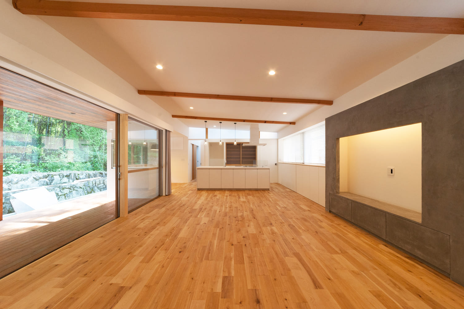 意匠として室内に現れる梁は、温もりあるアクセントとなり、平屋ならではの個性的で広々とした、伸びやかな空間を演出します。