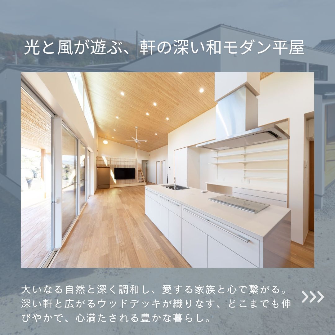 ・深い軒が美しい陰影を描き出し、伸びやかな佇まいが心を惹きつける和モダンの平屋から、研ぎ澄まされた美意識と卓越した機能性が見事に融合した、スタイリッシュな店舗併用住宅。