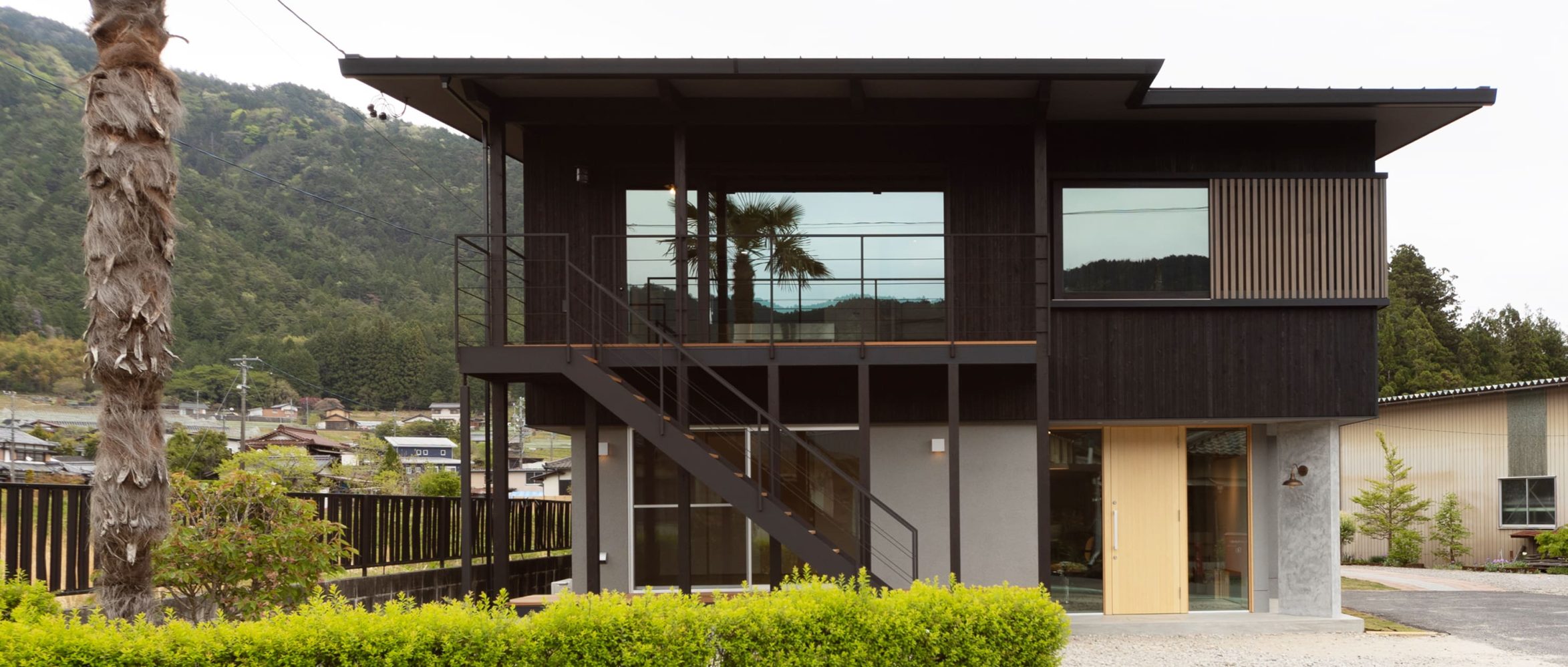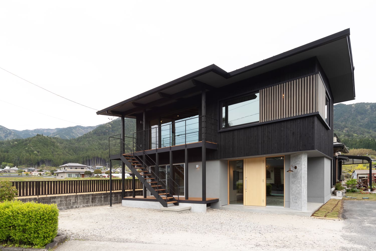 この特別な店舗併用住宅では、2階のプライベートな居住空間へと優しく誘う美しい外階段が、まさにその重要な役割を、完璧に、そして見事に果たしています。