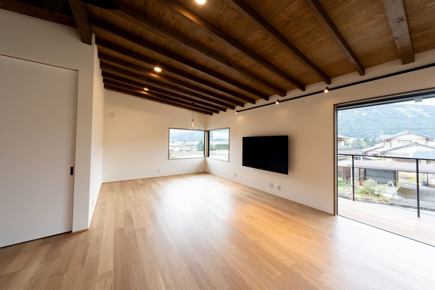 高く、そして美しくデザインされた勾配天井に、まるでアートのように大胆に現した温もりある木の梁と、肌触りまで伝わるような上質なパイン材の天井が、ナチュラルでありながらも、どこか洗練されたリゾートのような、特別な雰囲気を醸し出しています。
