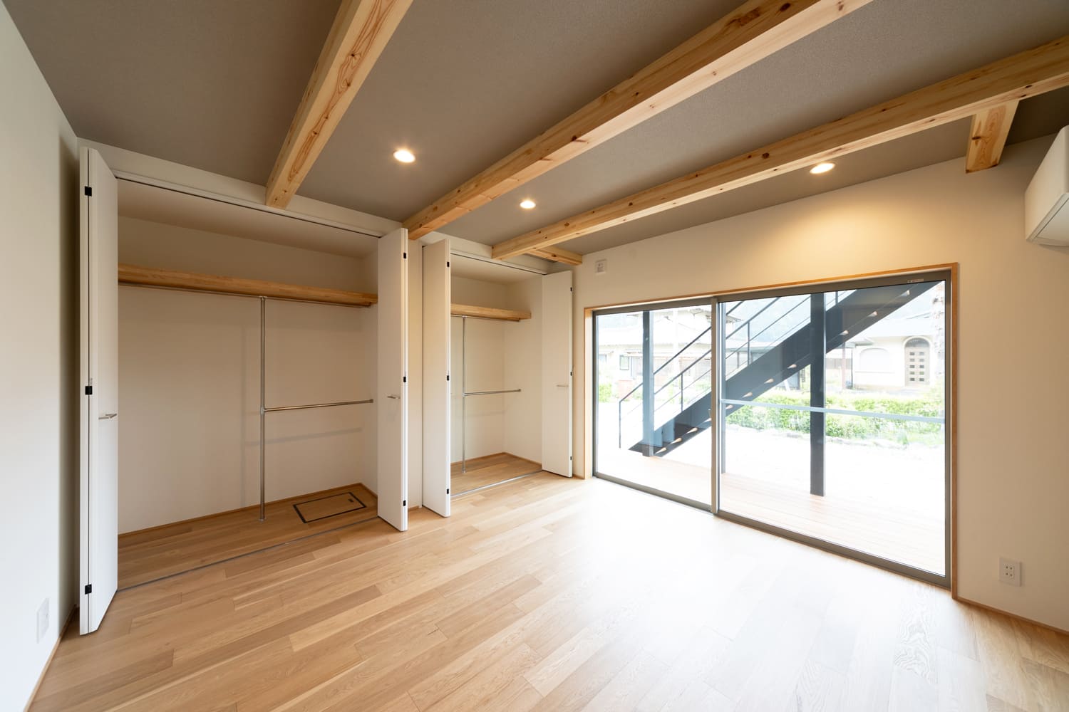 窓の外には、2階のバルコニーへと続く、お洒落なデザインの外階段がちらりと見え、まるで高級リゾートのヴィラに滞在しているかのような、特別な雰囲気をさらに高めています。