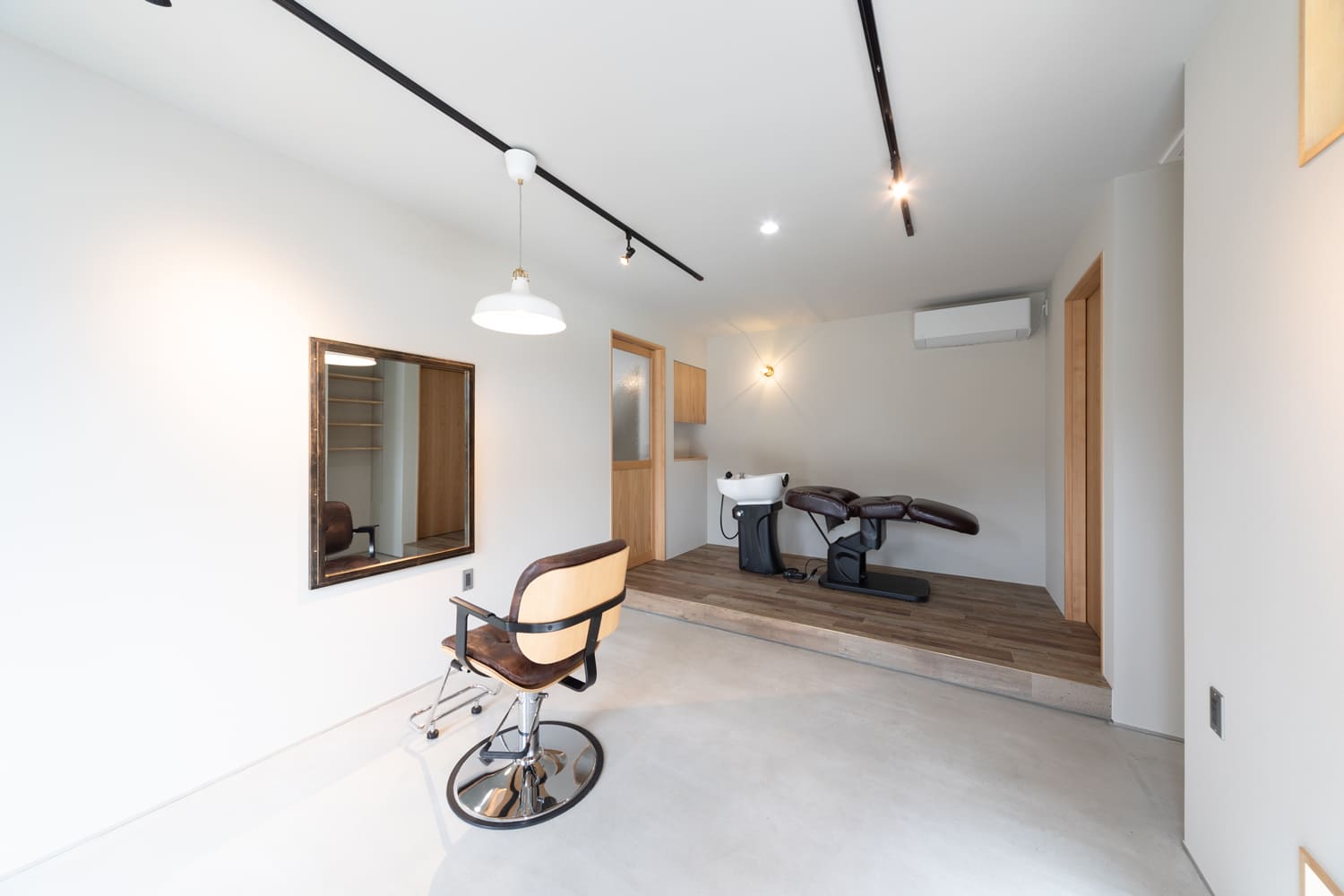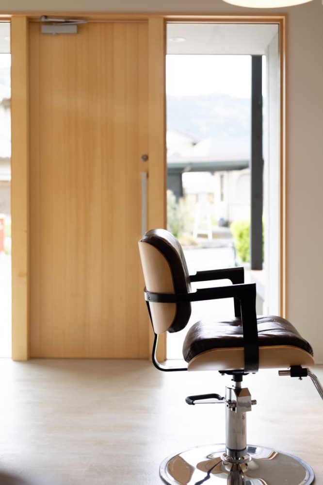 日々、美を求めるお客様を優しくお迎えする1階の美容院スペースは、ナチュラルで温もりあふれる木目調のドアと、クールでありながらもどこかアーティスティックなコンクリート打ちっぱなしの壁が、洗練されたモダンな印象を強く与えます。