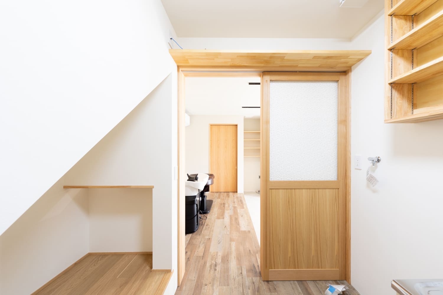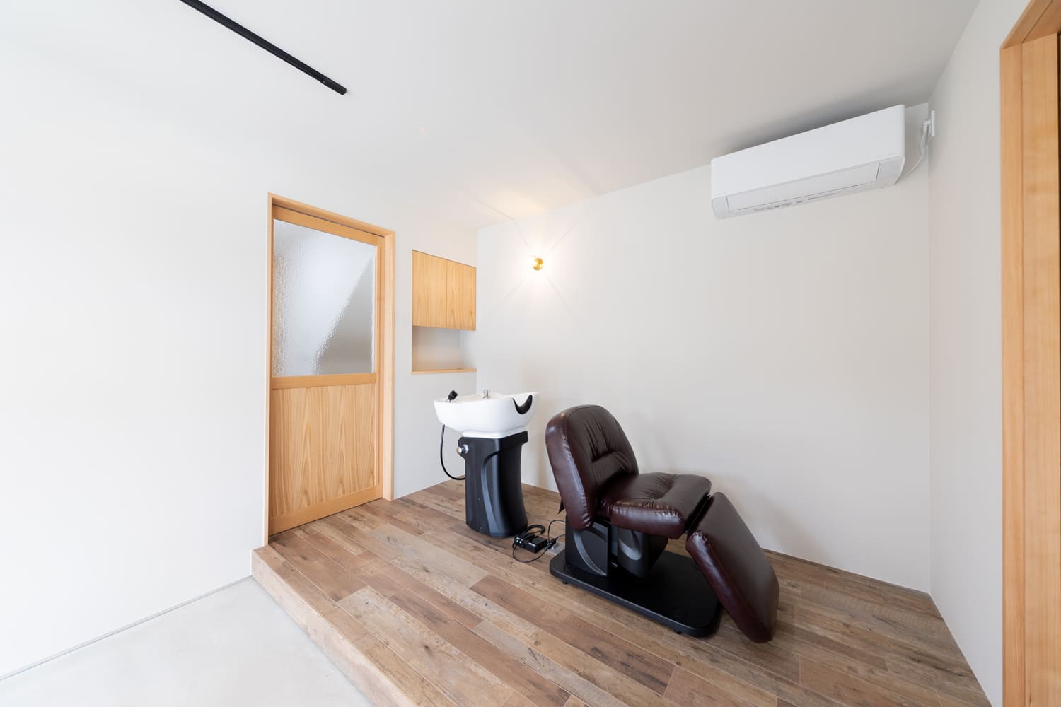 特別な癒やしの時間を約束するシャンプースペースは、一段高く、そしてまるで聖域のように設えられ、落ち着きと温もりを感じさせる木目調の床材で、空間を優しくゾーニング。