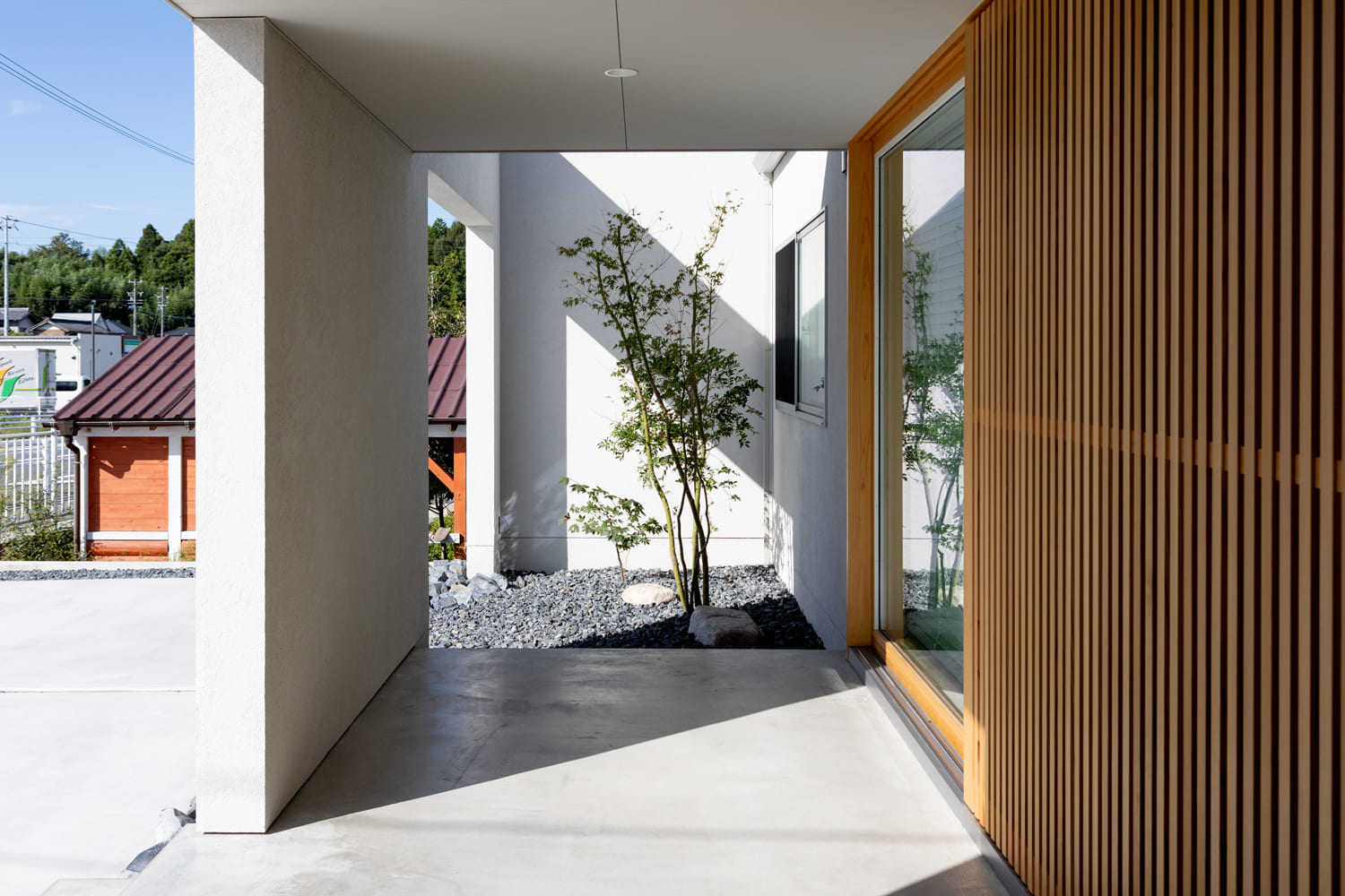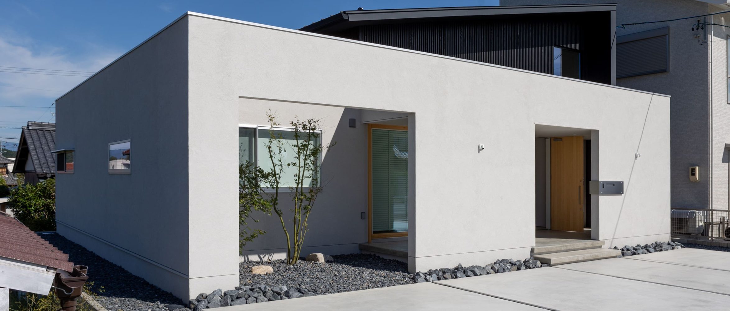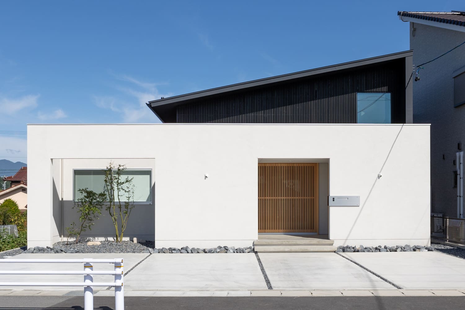 そのミニマルを極めた、一切の無駄を削ぎ落としたフォルムは、周囲の喧騒から、まるで聖域のように優しく切り離されたような、凛とした、そして気品あふれる佇まいを見せています。水平ラインを強く意識した、美しい白い壁は、まるで真っ白な大きなキャンバスのように、移りゆく太陽の光と、それによって生まれる柔らかな影を優しく受け止め、時間と共に、まるで生きているかのように変化する、豊かで詩的な表情を生み出します。