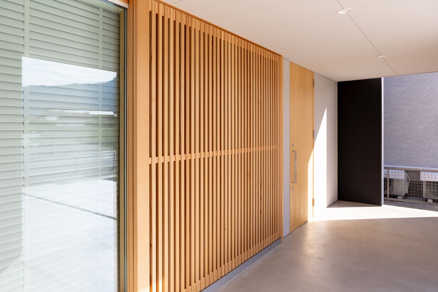 邸宅の玄関へと優しく誘うアプローチには、都会的でモダンなコンクリートと、肌で感じる温もりと安心感を与えてくれる、美しい木製の格子戸が、まるで長年連れ添ったパートナーのように見事に調和。