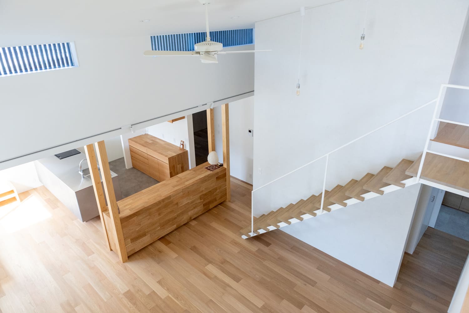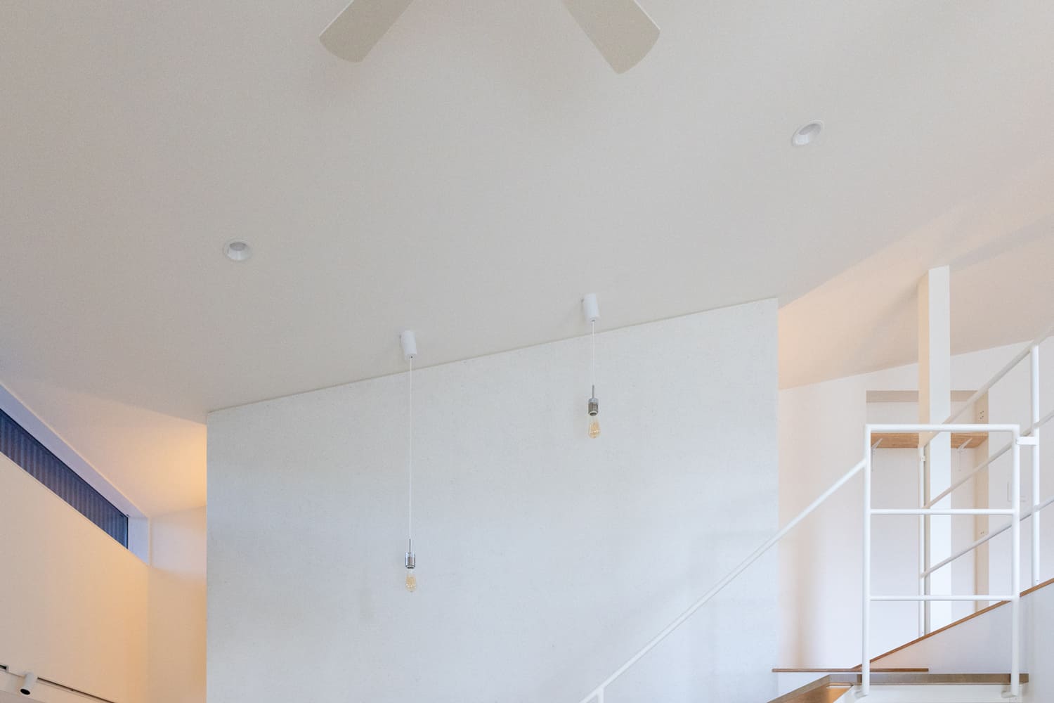 ふと視線を上げれば、まるでアート作品のように軽やかで美しいデザインのスケルトン階段が、清らかな白い壁に優しく映え、空間全体に、心地よいリズミカルなアクセントを添えています。
