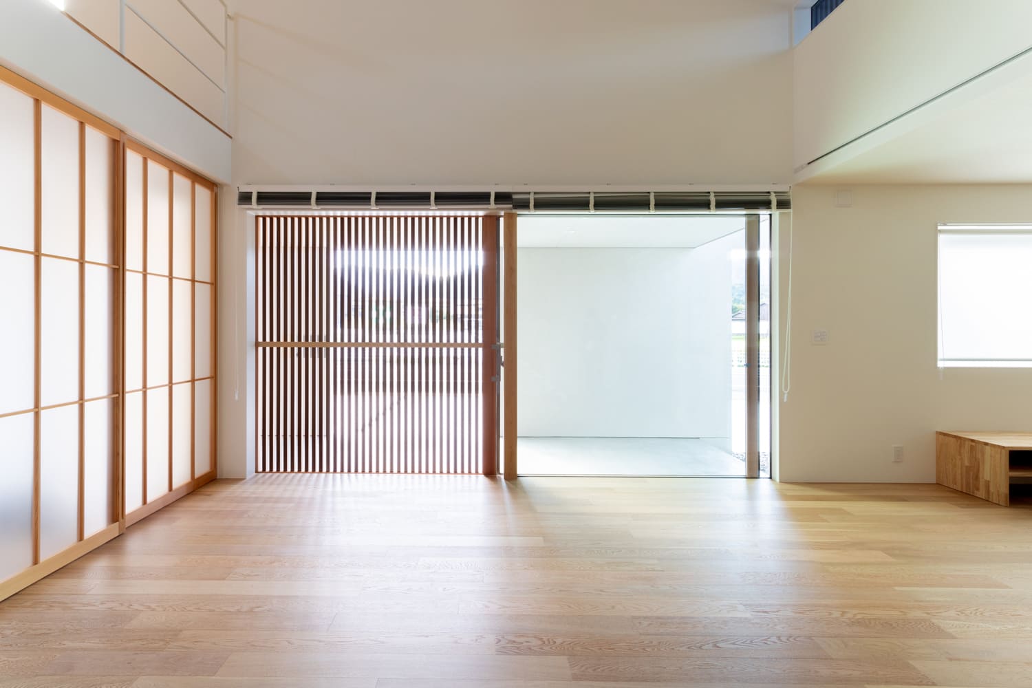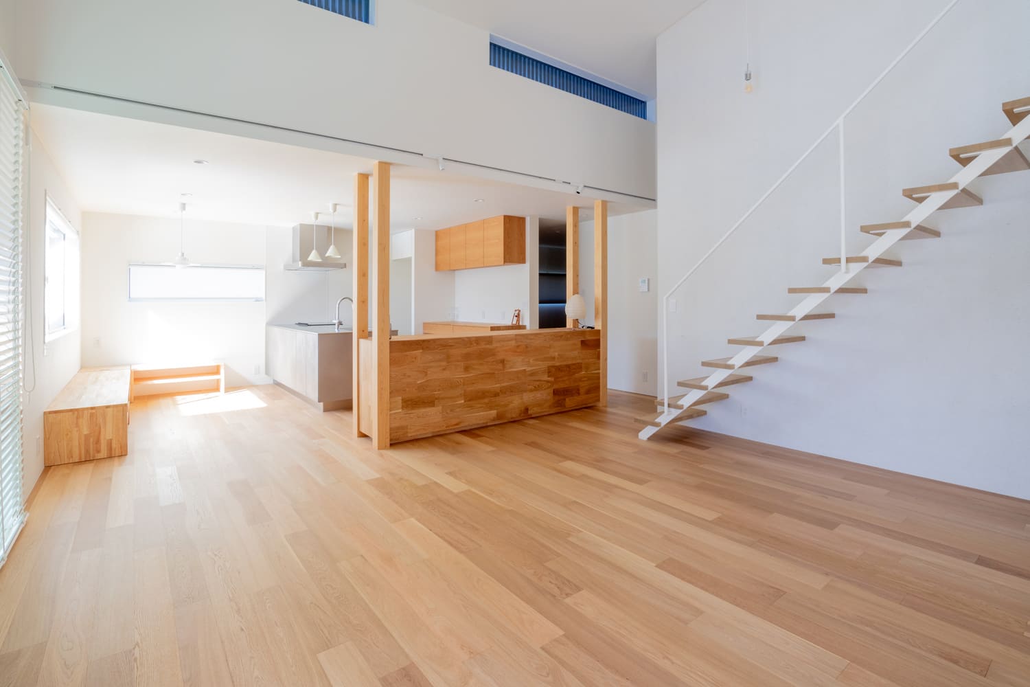 高く、そして美しくデザインされた吹き抜けの天井からは、柔らかな自然光が、まるで祝福のシャワーのようにたっぷりと降り注ぎ、素足に心地よい、上質な無垢材のフローリングが、足元からじんわりと、そして深く温もりを伝えます。