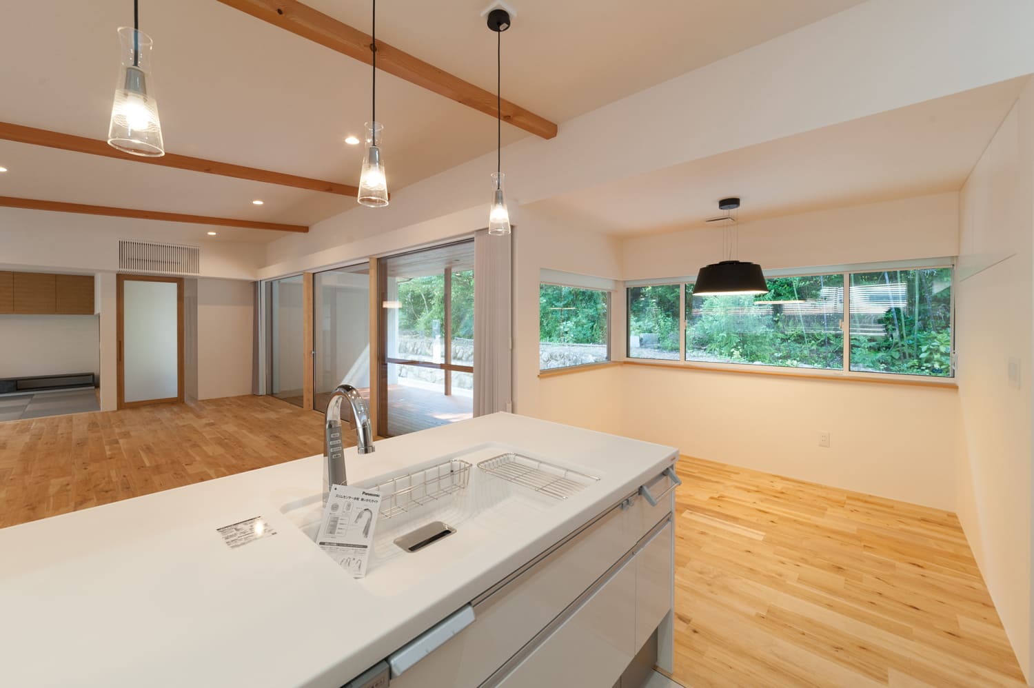 そして、空間にアクセントを添える、温もりあふれる「あらわしの梁」や、肌で感じる優しい木の温もりが、どこまでも洗練されたミニマルな空間の中に、心がほっとするような、温かみと安らぎを、絶妙なバランスで感じさせます。