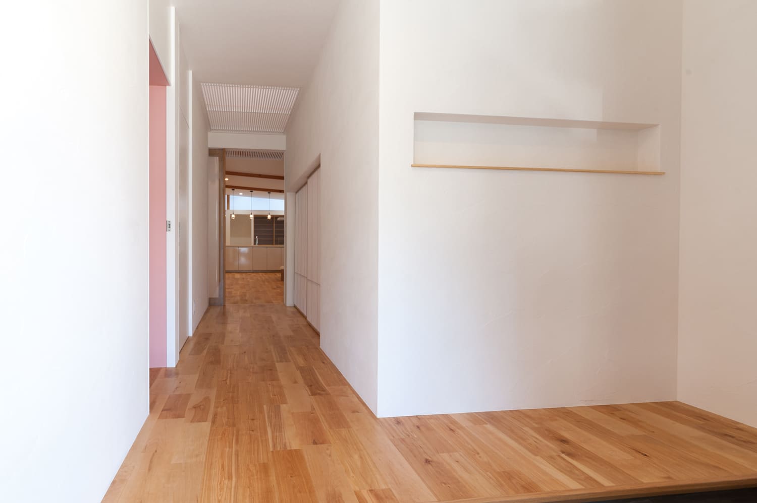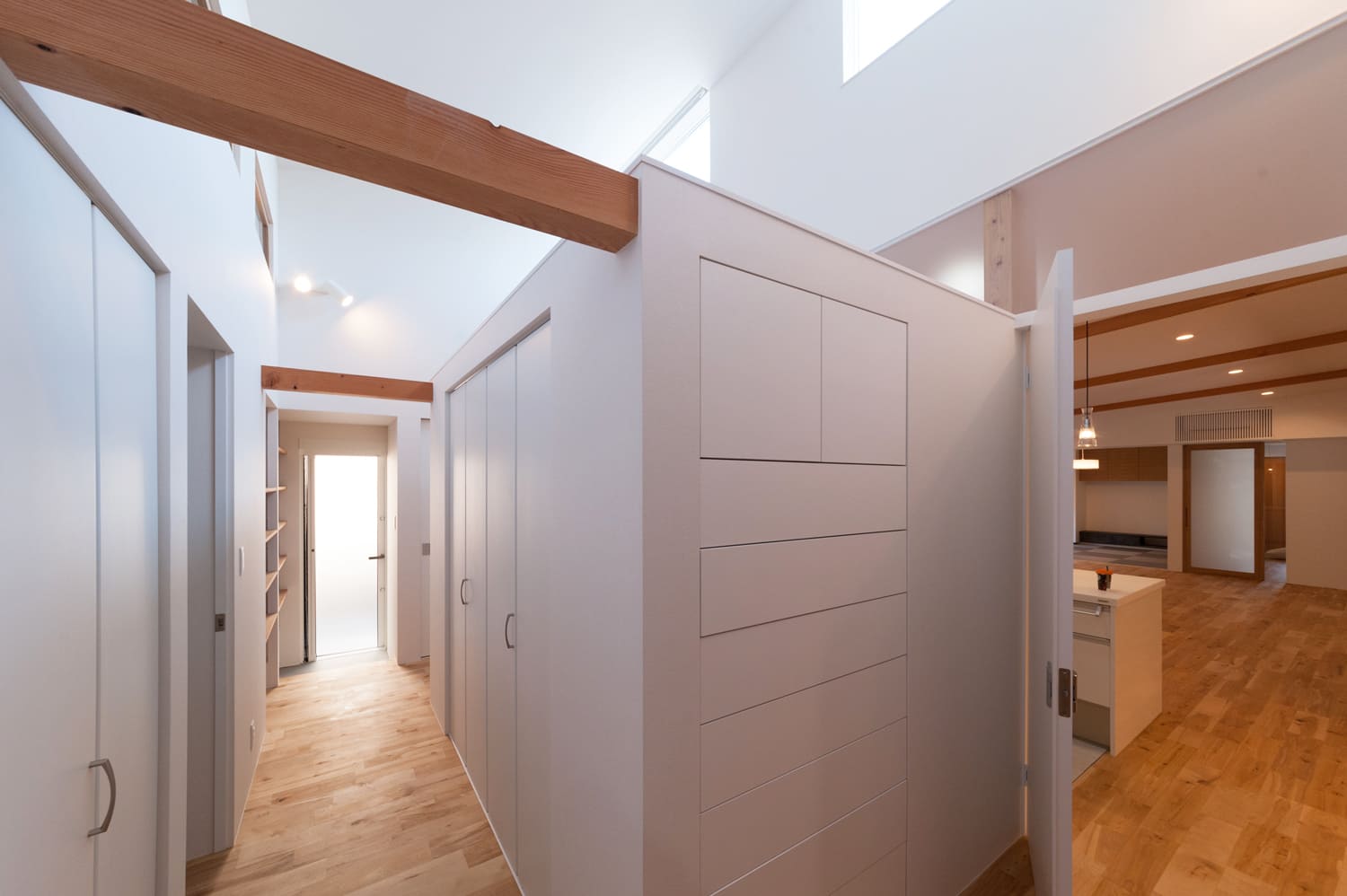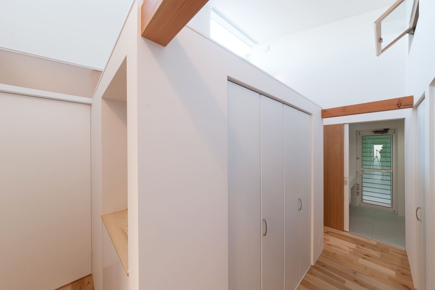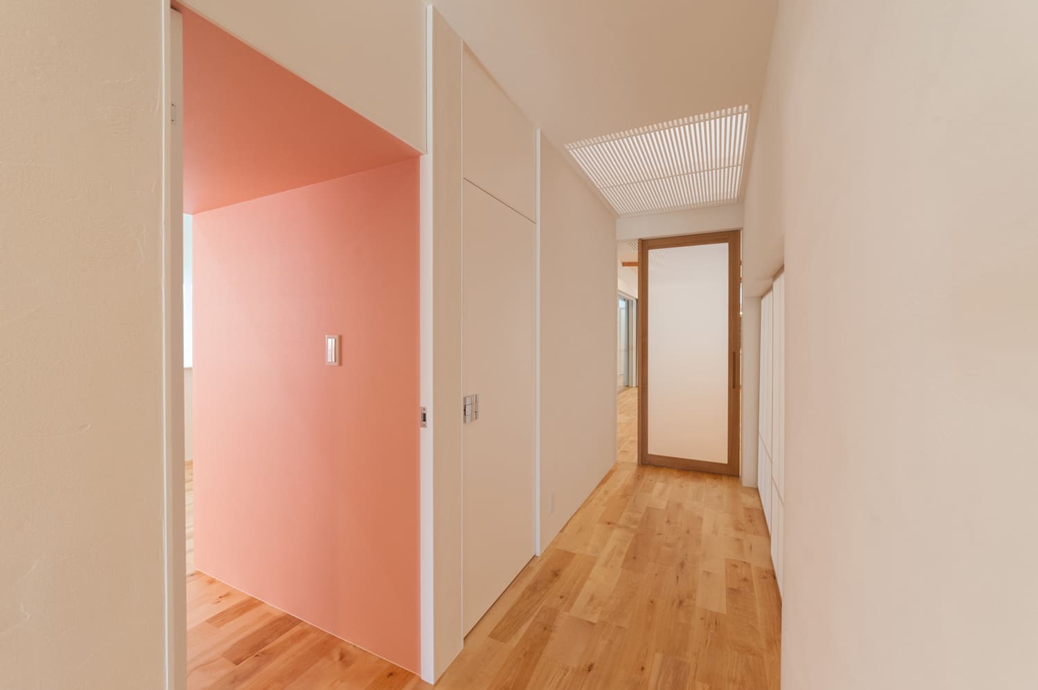 清らかで美しい白を基調とした、どこまでも明るく、そして清々しい廊下は、天井に効果的に設けられたトップライトや、壁にリズミカルに配置されたスリット窓から、まるで祝福のシャワーのように優しく差し込む、たっぷりの自然光が、空間全体に、豊かな奥行きと、心地よい変化を与えます。それは、単なる、家の中を移動するためだけの、無機質な通路としてだけでなく、まるで洗練された小さなアートギャラリーのように、壁に、お気に入りの美しいアート作品を飾ったり、思い出の詰まった大切な小物を、センス良くディスプレイしたりする、心ときめく楽しみも。