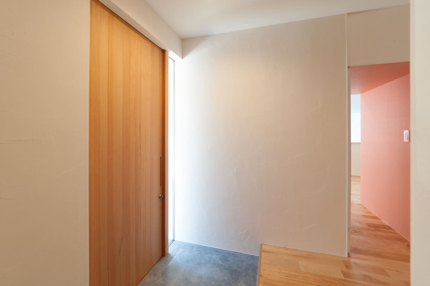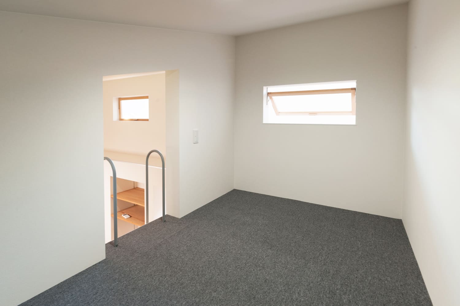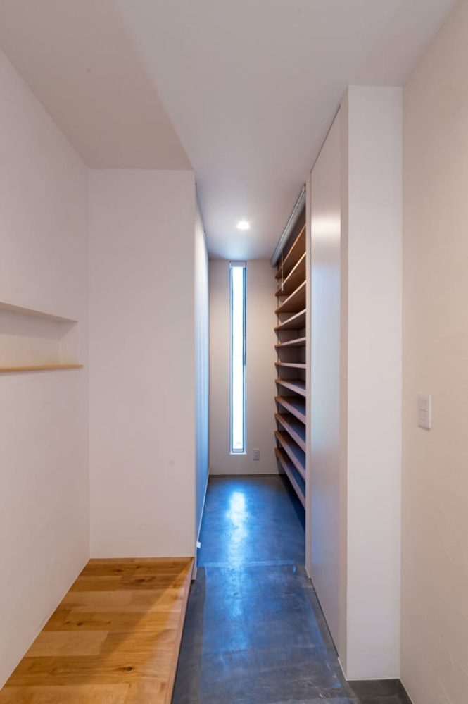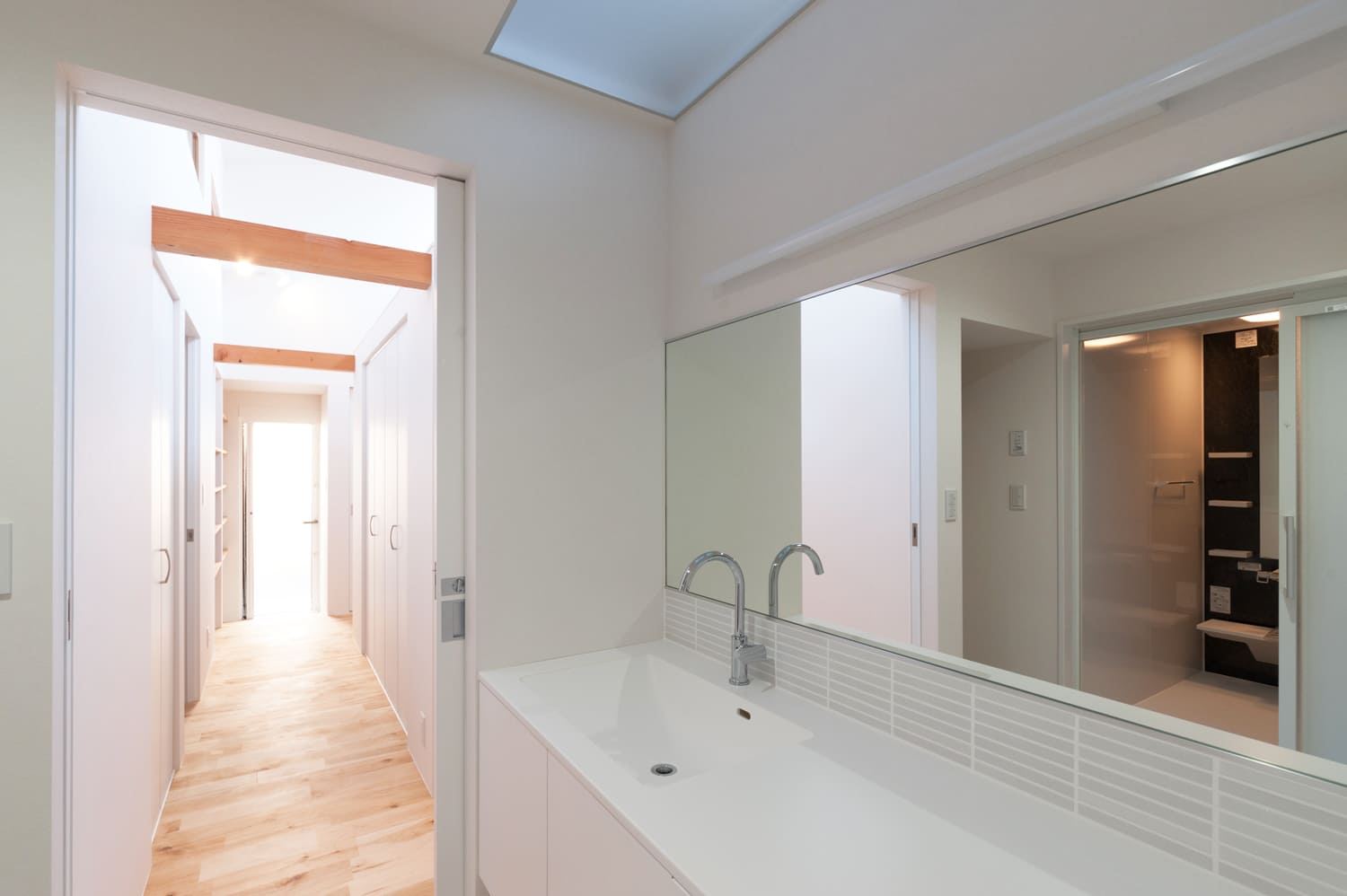 清らかで美しい白を基調とした、どこまでも明るく、そして清々しい廊下は、天井に効果的に設けられたトップライトや、壁にリズミカルに配置されたスリット窓から、まるで祝福のシャワーのように優しく差し込む、たっぷりの自然光が、空間全体に、豊かな奥行きと、心地よい変化を与えます。それは、単なる、家の中を移動するためだけの、無機質な通路としてだけでなく、まるで洗練された小さなアートギャラリーのように、壁に、お気に入りの美しいアート作品を飾ったり、思い出の詰まった大切な小物を、センス良くディスプレイしたりする、心ときめく楽しみも。