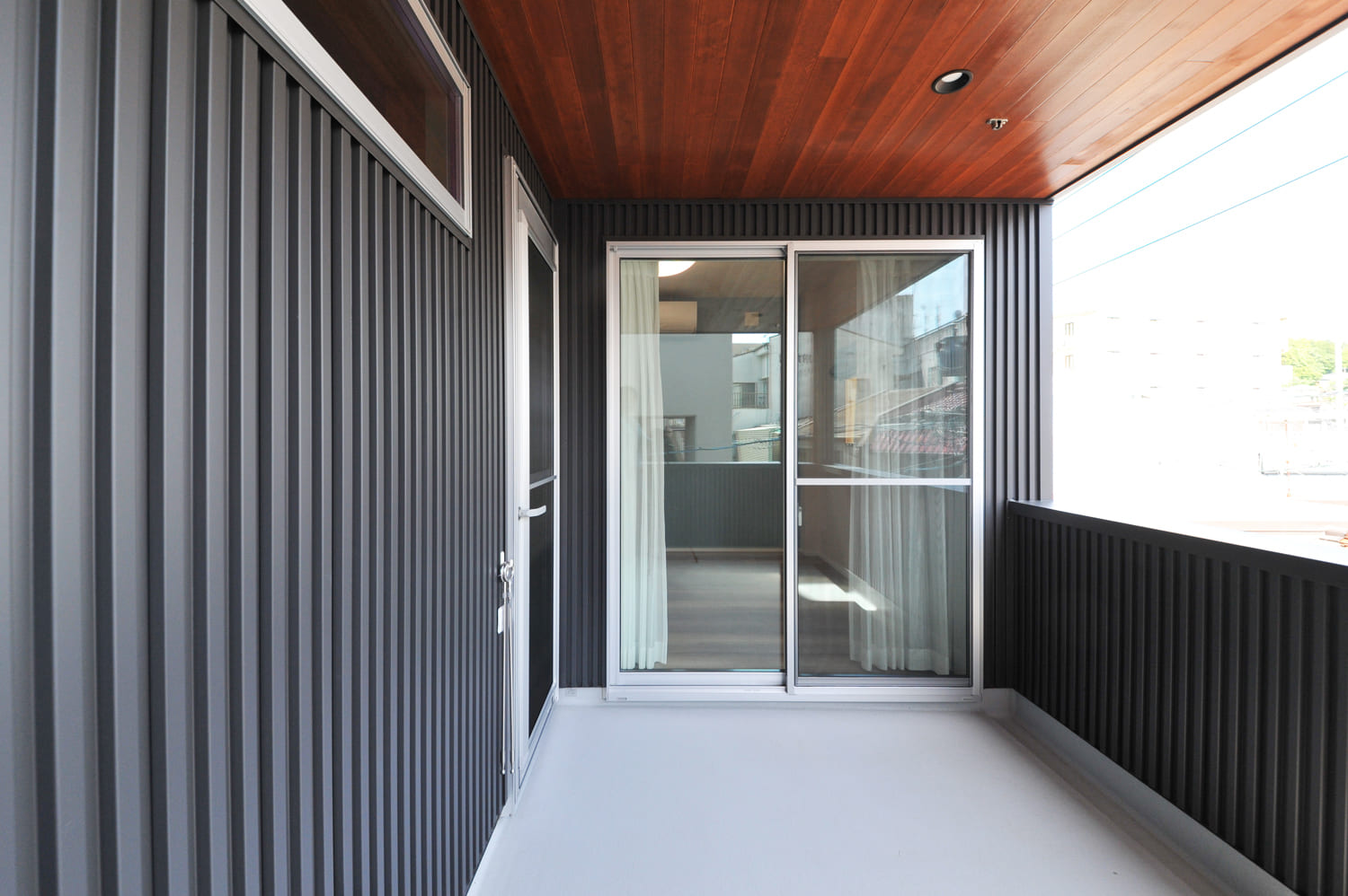 どこまでもシャープな、直線的な美しいラインで構成された、モダンなデザインの手すりや、まるで高級リゾートのテラスを思わせるような、上質なウッド調の美しい天井パネルが、どこまでもスタイリッシュで、そしてモダンな外観との、完璧な一体感を巧みに演出し、他にはない、洗練された、特別なアウトドアリビングのような、優雅な雰囲気を豊かに醸し出します。